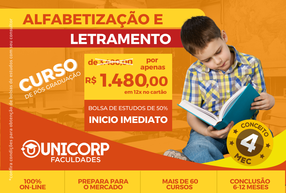Especialização em Alfabetização e Letramento (EAD), tem como objetivo preparar você para assumir importantes posições no mercado de trabalho da área de educação, adquirindo várias competências e conhecimentos, como o desenvolvimento do processo de aquisição da escrita, a aplicação da linguística no ensino da língua portuguesa e a superação das dificuldades em lidar com alunos portadores de distúrbios de aprendizagem.