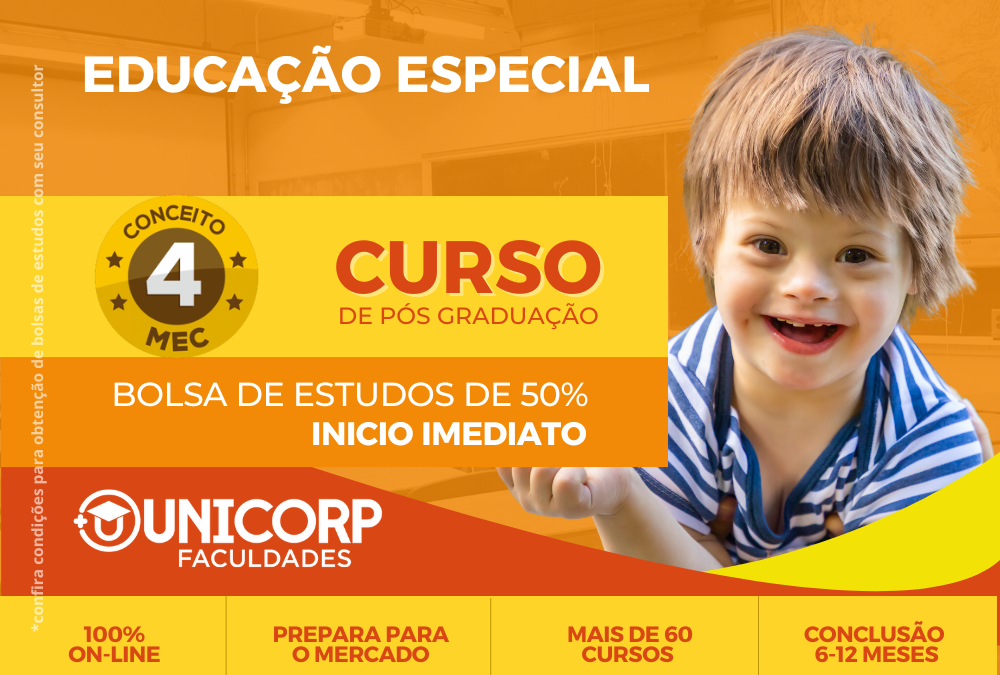Especialização em Educação Especial (EAD), tem como objetivo contribuir para que o profissional elabore, implemente e avalie propostas educacionais sustentadas nos conceitos, princípios e valores de uma escola para todos. Tendo como público-alvo quem é graduado em qualquer área. O nosso conteúdo é elaborado por um corpo docente composto de mestres, doutores e especialistas, proporcionando aos nossos alunos conteúdos atualizados e voltados para a prática profissional. Nossa plataforma (EAD) traz o que há de mais moderno disponibilizando aos alunos vídeo aulas, trilha de aprendizagem, e-books, slides, simulados, podcasts, atividades avaliativas, dentre outros de forma dinâmica, onde o aluno poderá fazer seu curso online em qualquer horário e em qualquer lugar. Os nossos cursos possuem uma carga horária estimada que permite o aluno cumprir as etapas do curso com tranquilidade e com o melhor aproveitamento possível.